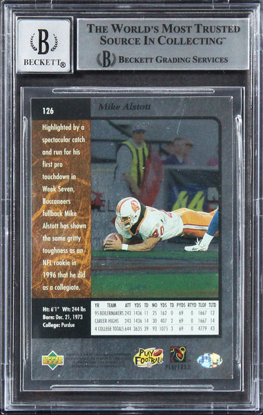 This Autographed Auto Graded Gem Mint 10! 1996 SP #126 Rookie Card with the inscription of "A-Train" has been Personally Signed by Mike Alstott of the Tampa Bay Buccaneers. This item is 100% Authentic, it comes slabbed and authenticated by Beckett Authentication Services. We have multiples of this same item. While the photographs are representative of this item, the size and placement of the signature may vary. Each item is hand signed, therefore, each autograph is unique.