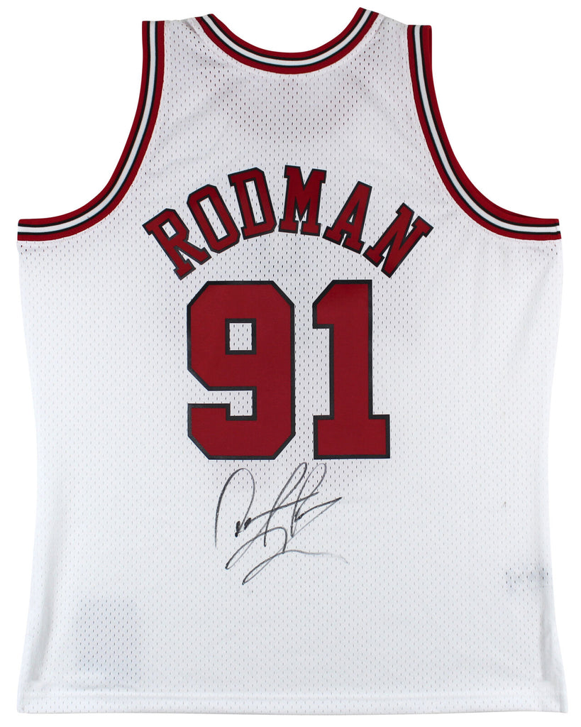 This Autographed White Mitchell & Ness Hardwood Classics Swingman Jersey has been Personally Signed by Dennis Rodman of the Chicago Bulls. This item is 100% Authentic to include a hologram by Beckett Authentication Services. This item will come with an affixed Beckett Authentication Services (BAS) authentication sticker, which includes a scannable QR code to verify authenticity. Please note that Beckett no longer provides serial-numbered COA cards, and the attached BAS sticker will serve as the complete authentication for this item. This is a BAS Witnessed Protection Program item which means a Beckett Authentication Service representative was present when this item was being signed. We conducted an autograph signing with Dennis Rodman where multiples of the same item were signed. While the photographs are representative of this item, the size, placement and strength of the signature may vary. Each item is hand signed, therefore, each autograph is unique. This item can be verified through BAS Witnessed. This is a X-Large sized, non-branded, custom-stitched Jersey.