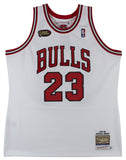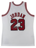 This Autographed White 1997-98 Mitchell & Ness Hardwood Classics Authentic Jersey has been Personally Signed by Michael Jordan of the Chicago Bulls. This item is 100% Authentic to include a Certificate of Authenticity (COA) / hologram by Beckett Authentication Services. The authenticity can be verified on Beckett Authentication Services website. This is a X-Large sized Jersey. The signature is also authenticated by Upper Deck, but does not come with the matching COA.
