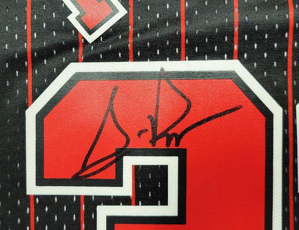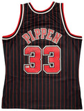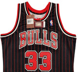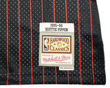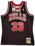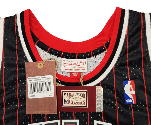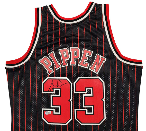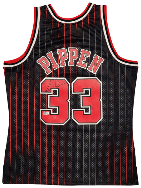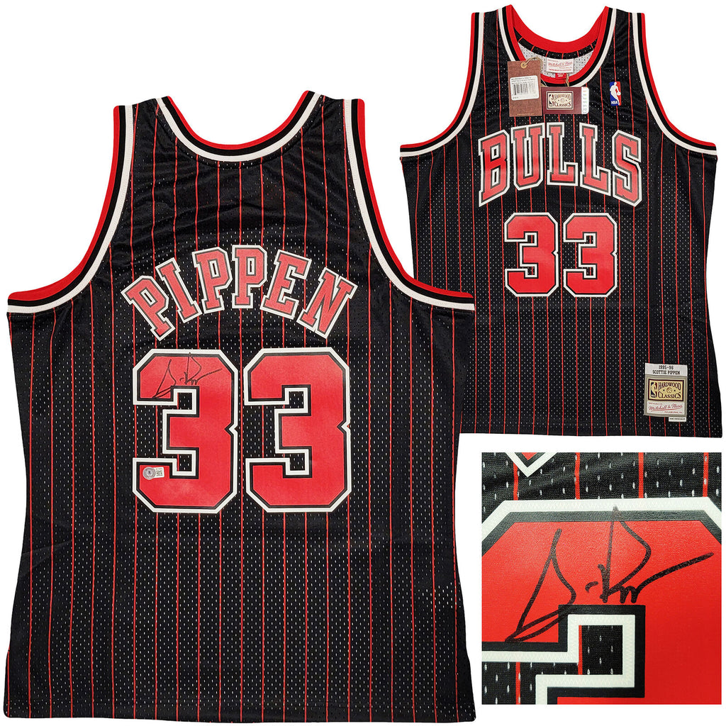 This is a Black Authentic Mitchell & Ness Chicago Bulls 1995-96 Hardwood Classics Swingman Jersey that has been hand signed by Scottie Pippen. This jersey is Size L. This item has been witnessed and certified authentic by Beckett Authentication (BAS) and comes with their tamper-proof witness sticker. Beckett Authentication has recently changed their physical certificate card policy where they no longer match their tamper-proof sticker with a physical certificate. A certificate can be printed on Beckett's website for the matching authentication number.