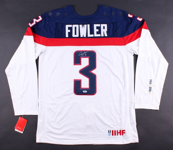Nike on-ice style jersey. Everything sewn on, size XL. Hand-signed in silver paint pen by Cam Fowler (Ducks). The autograph includes an official Beckett Authentication Services serially numbered hologram and matching COA for authenticity purposes.Authentication: Beckett COA