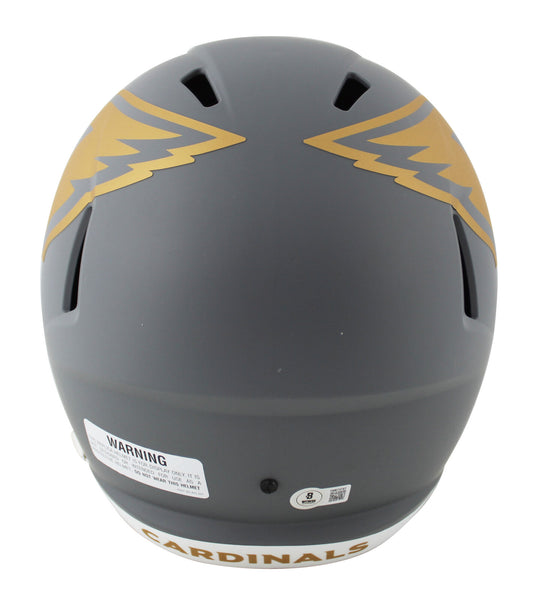 This Autographed Alternate Slate Riddell Full Size Speed Rep Helmet has been Personally Signed by Kurt Warner of the Arizona Cardinals. This item is 100% Authentic to include a hologram by Beckett Authentication Services. This item will come with an affixed Beckett Authentication Services (BAS) authentication sticker, which includes a scannable QR code to verify authenticity. Please note that Beckett no longer provides serial-numbered COA cards, and the attached BAS sticker will serve as the complete authentication for this item. This is a BAS Witnessed Protection Program item which means a Beckett Authentication Service representative was present when this item was being signed. We conducted an autograph signing with Kurt Warner where multiples of the same item were signed. While the photographs are representative of this item, the size, placement and strength of the signature may vary. Each item is hand signed, therefore, each autograph is unique. This item can be verified through BAS Witnessed.
