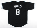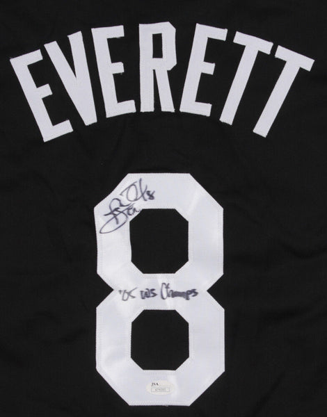 Custom on-field style jersey. Everything sewn on, size XL. Hand-signed and inscribed in black felt-tip pen by Carl Everett. The lot / autograph(s) includes an official James Spence Authentication (JSA) hologram and matching COA for authenticity purposes.Authentication: JSA COA