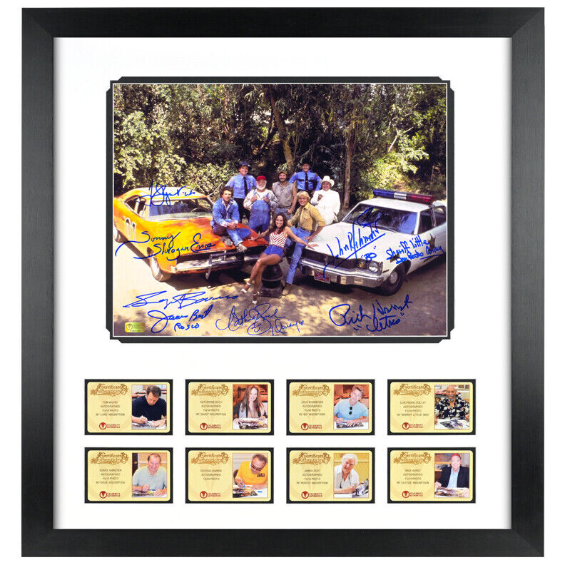 This 11x14 cast photo from The Dukes of Hazzard has been personally hand-signed by eight members of the cast including John Schneider (Bo Duke), Tom Wopat (Luke Duke), Catherine Bach (Daisy Duke), the late James Best (Sheriff Rosco P. Coltrane), Sonny Shroyer (Deputy Sheriff Enos Strate), Rick Hurst (Deputy Cletus Hogg), Don Pedro Colley (Sheriff Edward Thomas "Big Ed" Little) and George Barris during their signings with Celebrity Authentics with each adding their character names. Item ships affixed with the Celebrity Authentics serial-numbered and tamper evident Authentication Hologram and includes Celebrity Authentics Certificates of Authenticity featuring a picture of the talent signing photo.Photo is meticulously dry mounted and framed using acid free backing and mat boards with white core for the finest in presentation. UV protective glass with precision cut moulding are used for smooth, clean frame edges, hand assembled in our studio. Additionally, a protective back cover is used to seal the piece with corner bumpers applied to protect your walls, providing adequate air flow. A hanger is affixed to complete the finished collectible. Each framed photo is carefully wrapped for shipping with double protective corners and cushioning to help ensure the item's safe arrival. Celebrity Authentics Framing Studios - acclaimed as the industry's finest!Please note: with multiples signed by the actor, a sample photo is used from stock to represent what you will receive. Exact autograph size and placement may vary.