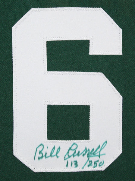 This Autographed Limited Edition #113/250 Green Pro Style Framed Jersey has been Personally Signed by Bill Russell of the Boston Celtics. This item is 100% Authentic to include a Certificate of Authenticity (COA) / hologram by Beckett Authentication Services. The authenticity can be verified on Beckett Authentication Services website. This item has been professionally framed to overall dimensions of approximately 34.5 x 42.75 inches.