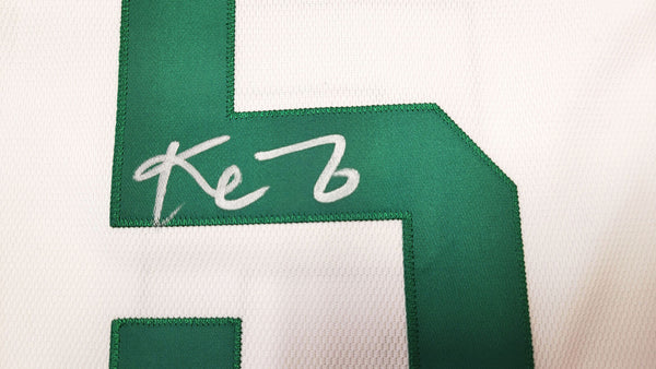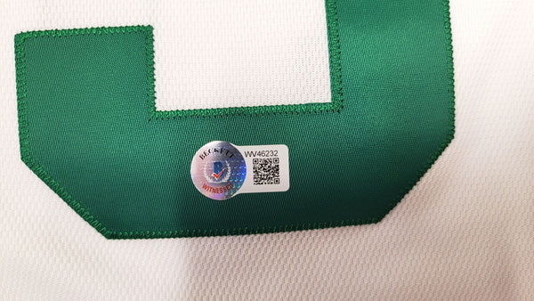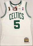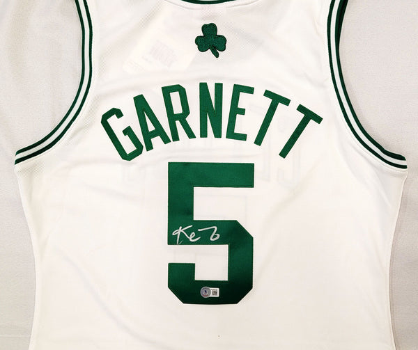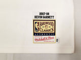 This is a White Mitchell & Ness 2007-08 Hardwood Classics NBA Finals Patch Boston Celtics Jersey that has been hand signed by Kevin Garnett. This jersey is Size M. This item has been witnessed and certified authentic by Beckett Authentication (BAS) and comes with their tamper-proof witness sticker. Beckett Authentication has recently changed their physical certificate card policy where they no longer match their tamper-proof sticker with a physical certificate. A certificate can be printed on Beckett's website for the matching authentication number.
