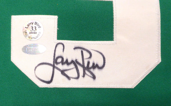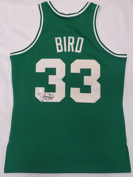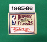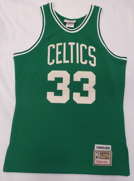 This is a Green 1985-86 Mitchell & Ness Boston Celtics Jersey that has been hand signed by Larry Bird. This jersey is Size 40. There is an imperfection in the signature as shown. This item has been certified authentic by Steiner and comes with their tamper-proof sticker.