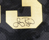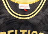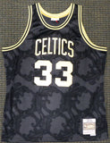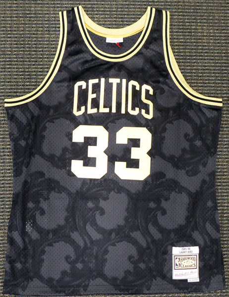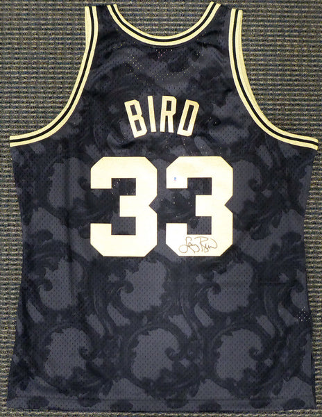 This is a Black Mitchell & Ness Boston Celtics Gold Toile Swingman Jersey that has been hand signed by Larry Bird. This one is size XL. This item has been certified authentic by Beckett (BAS) and comes with their tamper-proof sticker and matching certificate of authenticity.