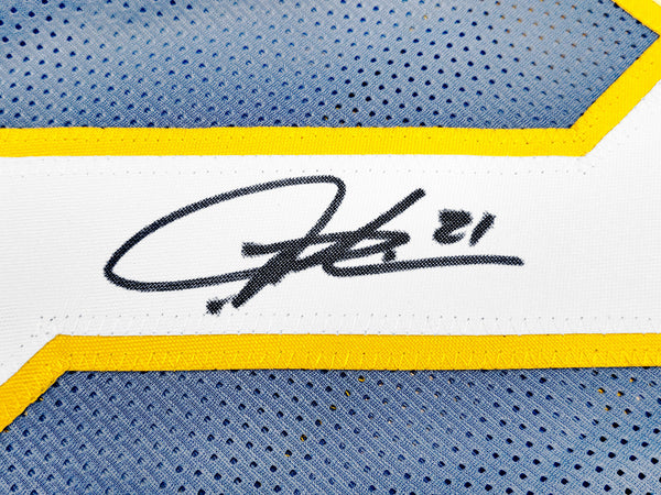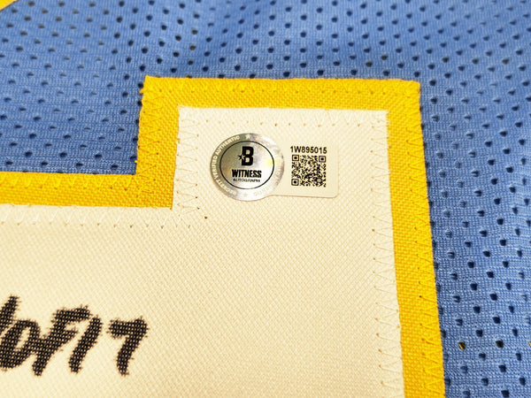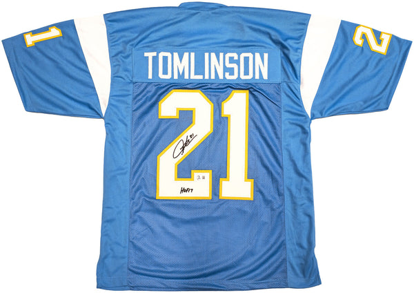 This is a Powder Blue Jersey that has been hand signed by LaDainian Tomlinson. This is a custom jersey with no name brand. The approximate size is XL. It has nice sewn in name and numbers. This item was inscribed "HOF 17." This item has been witnessed and certified authentic by Beckett Authentication (BAS) and comes with their tamper-proof witness sticker.