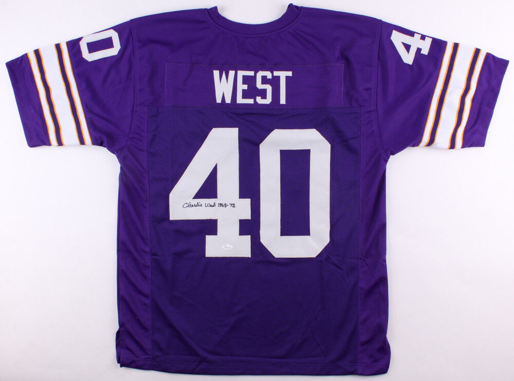 Custom on-field style jersey, everything is sewn on, size XL. Hand-signed in black felt-tip pen by Charlie West. The lot / autograph(s) includes an official James Spence Authentication (JSA) hologram and matching COA for authenticity purposes. The signing of this item was witnessed by JSA.Authentication: JSA COA