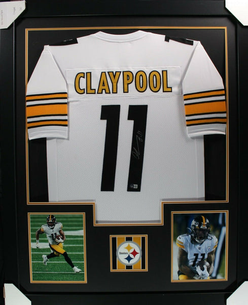 CHASE CLAYPOOL AUTOGRAPHED & PROFESSIONALLY FRAMED PRO-STYLE JERSEY(Occasionally our own stock pictures are used at times due to quantity of framing, all frames will look identical as the one pictured)THE FRAMED JERSEY MEASURES 35"x 44" & COMES WITH THE FOLLOWING:-UV Protected Acrylic-Triple Acid Free Team Colored Matting-2 High Quality 8"x10" Photos-Team LogoEvery framed autographed jersey is accompanied with a tamper-proof hologram on the signed part of the jersey from one of the main authenticators in the industry (JSA, Beckett, PSA, etc.) and can be verified on their corresponding websites to prove authenticity.ATTENTION:If there's any damage during shipping then please message us immediately and save the box!DO NOT OPEN A RETURN OR DISPUTE PLEASE!We will provide a return label to send the frame back so we can fix any issues right away and ship it right back to you, free of charge of course!WE DO NOT OFFER PARTIAL REFUNDS TO FIX LOCALLY AS EVERYTHING IS FRAMED/FIXED IN HOUSE- Thank you -