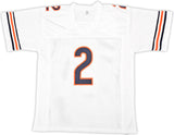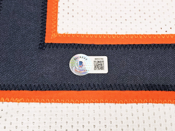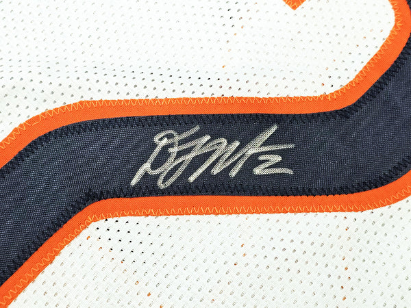 This is a White Jersey that has been hand signed by DJ Moore. This is a custom jersey with no name brand. The approximate size is XL. It has nice sewn in name and numbers. This item has been witnessed and certified authentic by Beckett Authentication (BAS) and comes with their tamper-proof witness sticker.
