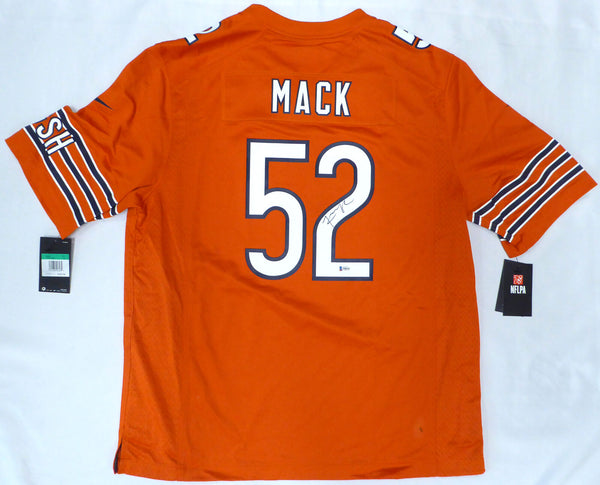 This is an Orange Nike Chicago Bears Jersey that has been hand signed by Khalil Mack. NOTE: There is a stain on the jersey, as shown in the pictures. This item has been certified authentic by Beckett Authentication (BAS) and comes with their tamper-proof QR Code sticker that can be verified on the Beckett-authentication.com.