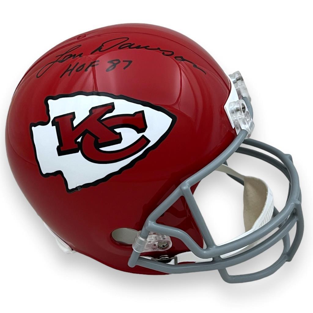 This signed item is brand new in box. This item will make a great gift or a great addition to any collection at an AFFORDABLE PRICE! ATHLETE: Len Dawson ITEM: Kansas City Chiefs Full Size Replica Helmet AUTHENTICATION: This item comes with a PSA/DNA Certificate of Authenticity and serial #'ed hologram affixed to the item. To ensure authenticity, the hologram can be reviewed online. This process helps to ensure that the product purchased is authentic and eliminates any possibility of duplication or fraud. This item was signed in the presence of a Beckett representative.