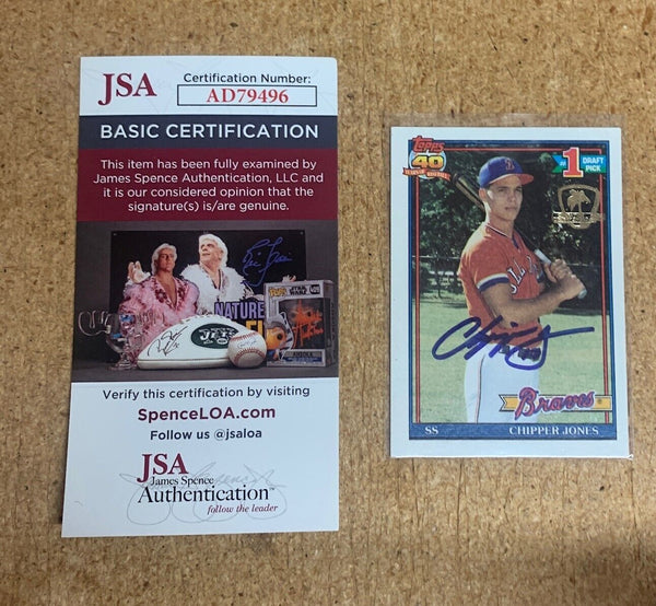 Chipper Jones has autographed this card. It has been framed with an 8x10 photo. Frame measures 15x21. Autograph is authenticated by JSA (James Spence Authentication) the leading authenticator of sports autographs. Comes with their unique sticker # fixed to the item and verified on their website. Also comes with their certificate of authenticity with same matching #.