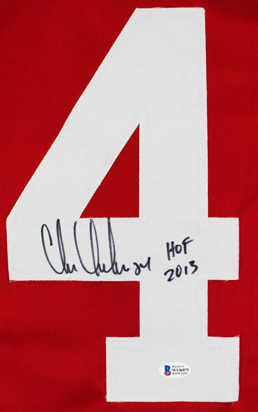 This Autographed Red Pro Style Jersey with the inscription of "HOF 2013" has been Personally Signed by Chris Chelios of the Detroit Red Wings. This item is 100% Authentic to include a Certificate of Authenticity (COA) / hologram by Beckett Authentication Services. We have multiples of this same item. While the photographs are representative of this item, the size, placement and strength of the signature may vary. Each item is hand signed, therefore, each autograph is unique. This is a X-Large sized, non-branded, custom-stitched Jersey.