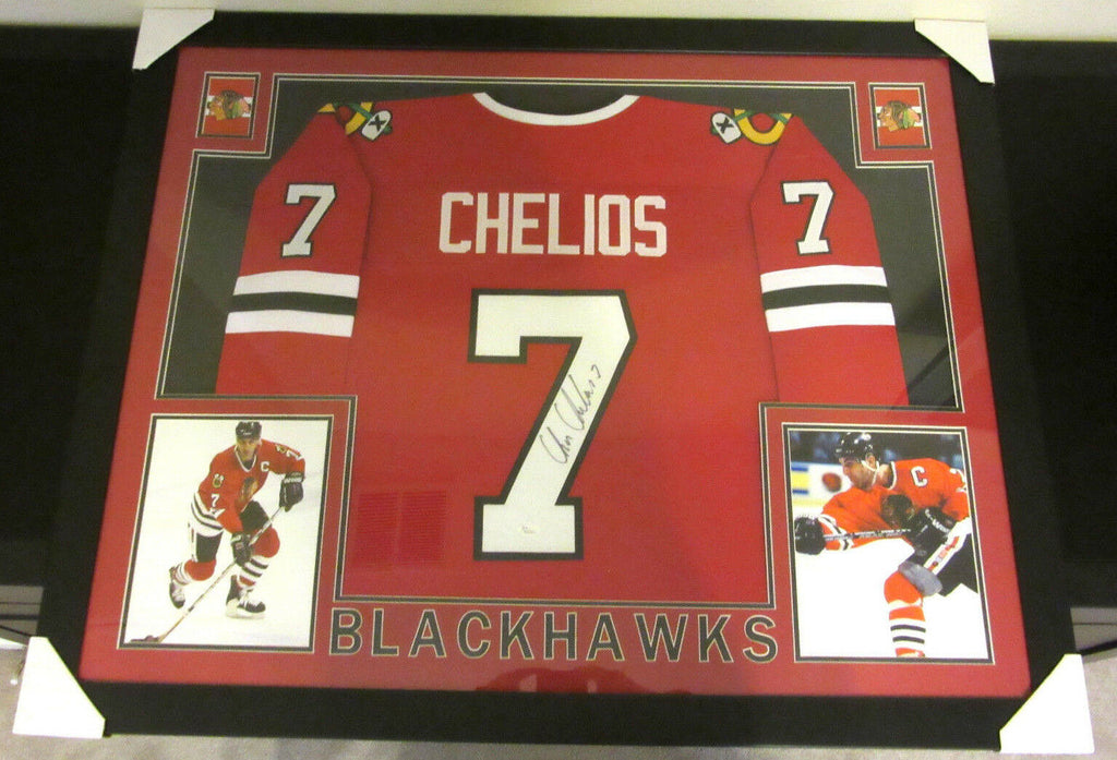 Custom frame measures approximately 35" x 43" in size and features a jersey which has been hand-signed in black felt tip pen by Chris Chelios. The autograph includes an official James Spence Authentication (JSA) hologram and matching COA for authenticity purposes. The signing of this item was witnessed by JSA.Authentication: JSA COA