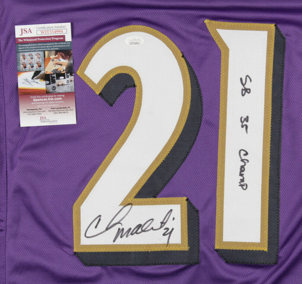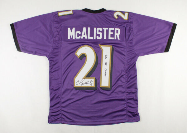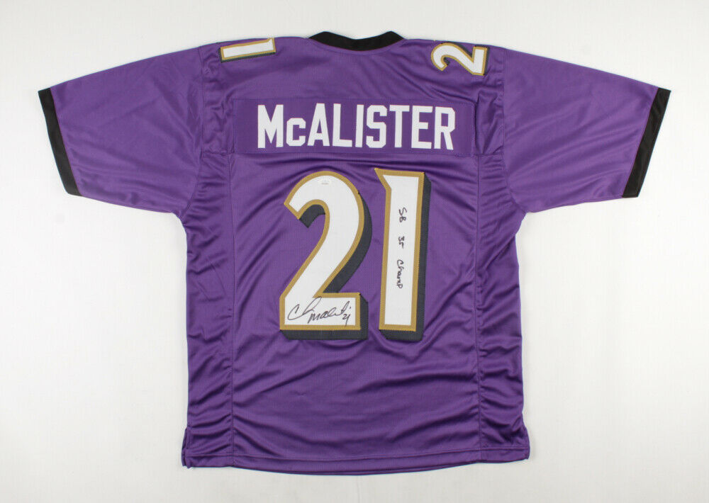 Custom on-field style jersey. Everything is sewn on, size XL. Hand-signed by Chris McAlister.The lot / autograph(s) includes an official James Spence Authentication (JSA) hologram and matching COA for authenticity purposes. The signing of this item was witnessed by JSA.Authentication: JSA COA