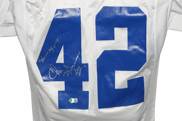 Chris Warren Autographed Dallas Cowboys Game Issued White Jersey BAS 33608 The number in the listing title is just an inventory sku for our records and is not the authentication number. This is a Dallas Cowboys game issued white jersey that was personally autographed by Chris Warren. Includes a certificate of authenticity from Beckett Authentication Services (BAS) and Denver Autographs.