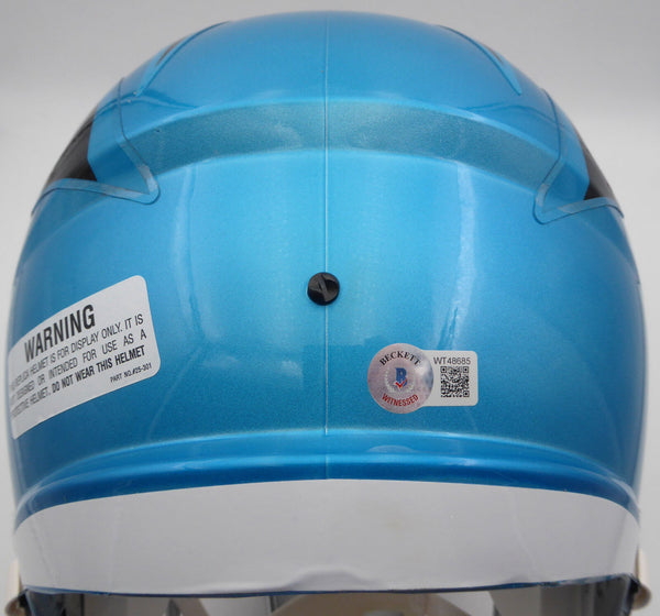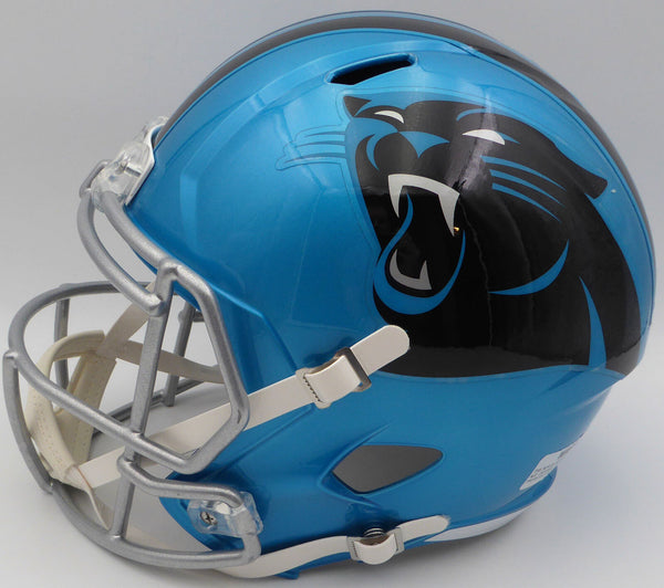 This is a Flash Blue Full Size Replica Helmet that has been hand signed by Christian McCaffrey. This item has been certified authentic by Beckett Authentication (BAS) and comes with their tamper-proof QR Code sticker that can be verified on the Beckett-authentication.com.