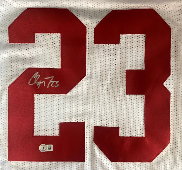 Featured is a Christian McCaffrey signed custom football jersey. This jersey has been hand signed by McCaffrey and comes with the Beckett hologram and certificate of authenticity. This jersey has professionally sewn letters and numbers and is size XL. This jersey has no team tags or emblems and is intended as a sports collectible. This jersey would make a great addition to any sports collection!. SPECIFICATIONS Autographed By: Christian McCaffrey Team: San Francisco 49ers Sport: Football Authentication: Beckett Grading Services