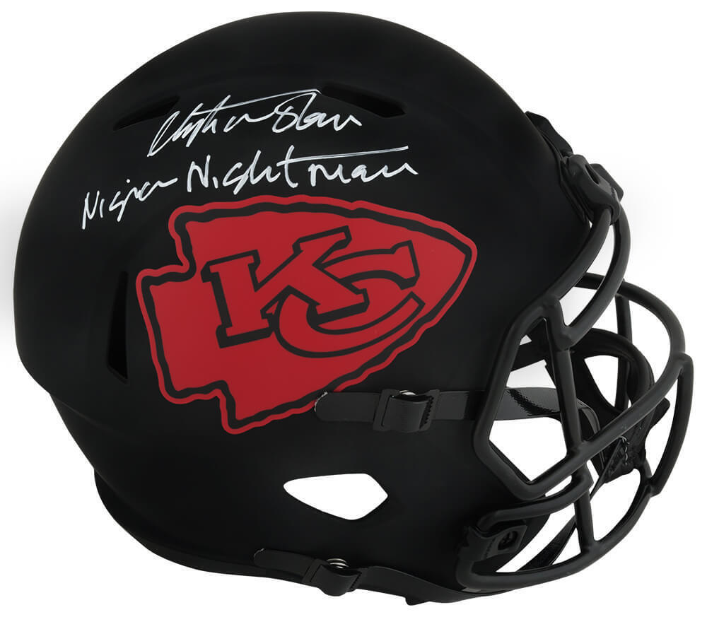 Christian Okoye signed Kansas City Chiefs Eclipse Riddell full size speed replica helmet with 'Nigerian Nightmare' inscription. Item comes with a Schwartz Sports Memorabilia tamper-proof numbered hologram and Certificate of Authenticity which can be verified online.