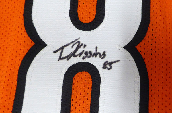 This is an Orange Jersey that has been hand signed by Tee Higgins. This is a custom jersey with no name brand. The approximate size is XL. It has nice sewn in name and numbers. This item has been certified authentic by Beckett Authentication (BAS) and comes with their tamper-proof QR Code sticker that can be verified on the Beckett-authentication.com.