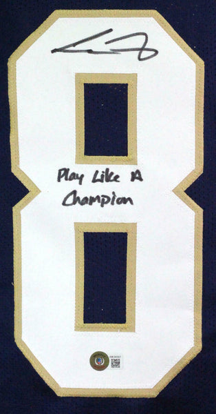 Cole Kmet Autographed Blue College Style Jersey w/ PLACT - Beckett W *Black THIS IS NOT AN NCAA JERSEY. THIS HAS NO TAGS, NO LOGOS, NO EMBLEMS. This is a Cole Kmet of the Notre Dame Fighting Irish hand autographed custom made (non name brand) authentic style (stitched letters and numbers) jersey inscribed with "Play Like A Champion Today". This item has a Beckett Witnessed Authentication, which comes with a numbered sticker and a matching Beckett Certificate of Authenticity. You can view this item on the Beckett Authentication website and it shows when and where the item was signed. It was signed either at a public autograph appearance or a private signing. This is a stock photo of the item. Although you may not receive this exact item, the item you receive is virtually identical, brand new, and in great shape. Jersey size is XL.