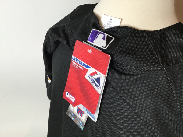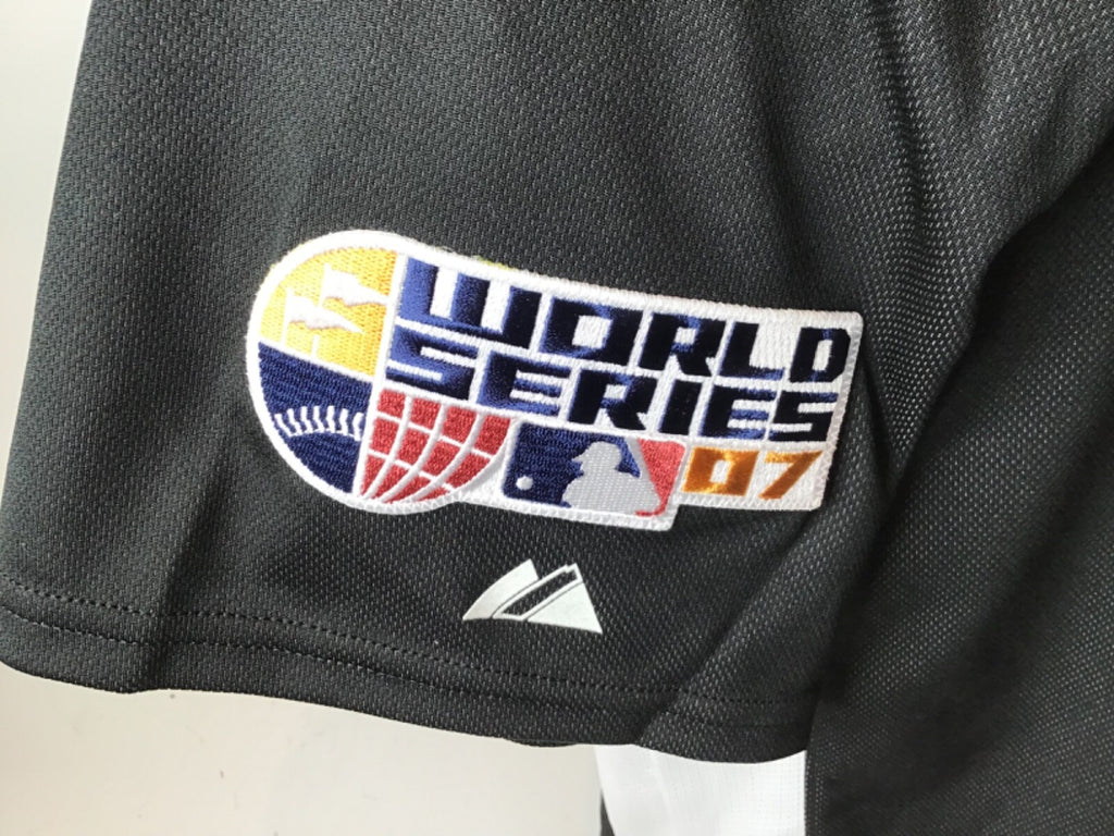 The product is an authentic Colorado Rockies baseball jersey from the 2007 World Series, featuring a black color scheme and a patch celebrating the team's championship. It is a Majestic Cool Base jersey that is signed by a player from the Rockies. This original jersey is a must-have for fans of the Colorado Rockies looking to add a rare and valuable piece to their sports memorabilia collection.New with tags. Size M.