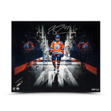 Construction on the multi-use indoor arena in Edmonton that would be the future home of the Oilers began in March of 2014. The new arena, named Rogers Place, officially opened on September 8, 2016 and replaced Northlands Coliseum, which had opened in 1974. Connor McDavid was an integral part of the inaugural season at the Oilers new home. Considered by many to be a generational talent, he did not disappoint in his second season in the NHL by netting 30 goals and 70 assists. The Oilers honored the inaugural season by sewing patches on their jerseys and hosting several events. This image of McDavid walking down the tunnel toward the locker room after stepping off the ice at their new home displays his focus and determination. McDavid's signature in silver paint pen is deemed authentic by virtue of Upper Deck Authenticated's Five-Step Process.