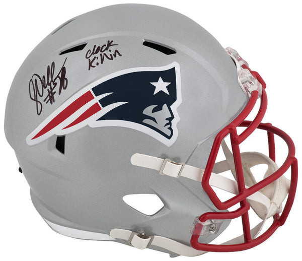 Corey Dillon signed New England Patriots Riddell full size speed replica helmet with 'Clock Killin' inscription. Item comes with a Schwartz Sports Memorabilia tamper-proof numbered hologram and Certificate of Authenticity which can be verified online.