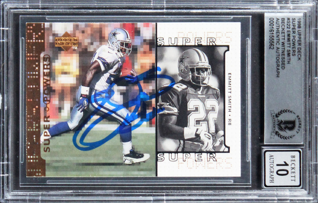 This Autographed Auto Graded Gem Mint 10! 1998 Upper Deck Super Powers #S22 Card has been Personally Signed by Emmitt Smith of the Dallas Cowboys. This item is 100% Authentic, it comes slabbed and authenticated by Beckett Authentication Services. The authenticity can be verified on Beckett Authentication Services website.
