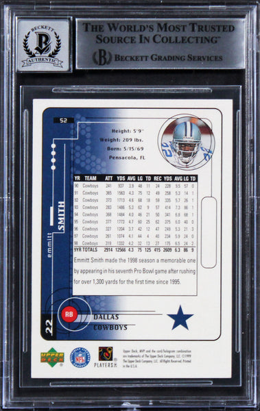 This Autographed Auto Graded Gem Mint 10! 1999 Upper Deck MVP #52 Card has been Personally Signed by Emmitt Smith of the Dallas Cowboys. This item is 100% Authentic, it comes slabbed and authenticated by Beckett Authentication Services. The authenticity can be verified on Beckett Authentication Services website.