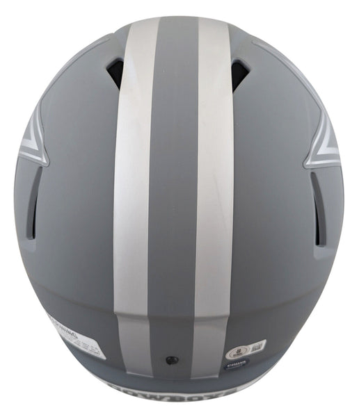This Autographed Alternate Slate Riddell Full Size Speed Rep Helmet has been Personally Signed by Emmitt Smith of the Dallas Cowboys. This item is 100% Authentic to include a hologram by Beckett Authentication Services. This item will come with an affixed Beckett Authentication Services (BAS) authentication sticker, which includes a scannable QR code to verify authenticity. Please note that Beckett no longer provides serial-numbered COA cards, and the attached BAS sticker will serve as the complete authentication for this item. This is a BAS Witnessed Protection Program item which means a Beckett Authentication Service representative was present when this item was being signed. We conducted an autograph signing with Emmitt Smith where multiples of the same item were signed. While the photographs are representative of this item, the size, placement and strength of the signature may vary. Each item is hand signed, therefore, each autograph is unique. This item can be verified through BAS Witnessed.