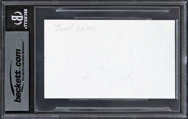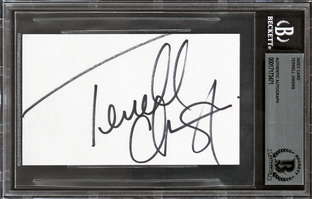 This Autographed 3x5 Index Card has been Personally Signed by Terrell Owens of the Dallas Cowboys. This item is 100% Authentic, it comes slabbed and authenticated by Beckett Authentication Services. The authenticity can be verified on Beckett Authentication Services website.