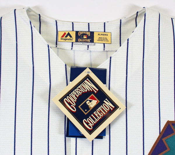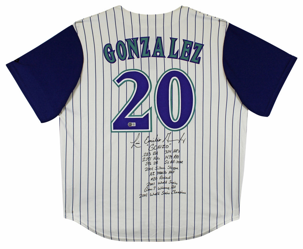 This Autographed White Pinstripe Majestic Cool Base Jersey with the inscription of ""Gonzo",.283 BA, 354 HRs, 2591 Hits, 1439 RBI, 596 2B, 5x All-Star, 2001 Silver Slugger, AZ Dbacks HOF, #20 Retired, 2001 World Series Game 7 Winning Hit, 2001 World Series Champions" has been Personally Signed by Luis Gonzalez of the Arizona Diamondbacks. This item is 100% Authentic to include a hologram by Beckett Authentication Services. This item will come with an affixed Beckett Authentication Services (BAS) authentication sticker, which includes a scannable QR code to verify authenticity. Please note that Beckett no longer provides serial-numbered COA cards, and the attached BAS sticker will serve as the complete authentication for this item. This is a BAS Witnessed Protection Program item which means a Beckett Authentication Service representative was present when this item was being signed. We conducted an autograph signing with Luis Gonzalez where multiples of the same item were signed. While the photographs are representative of this item, the size, placement and strength of the signature may vary. Each item is hand signed, therefore, each autograph is unique. This item can be verified through BAS Witnessed. This is a X-Large sized, non-branded, custom-stitched Jersey.
