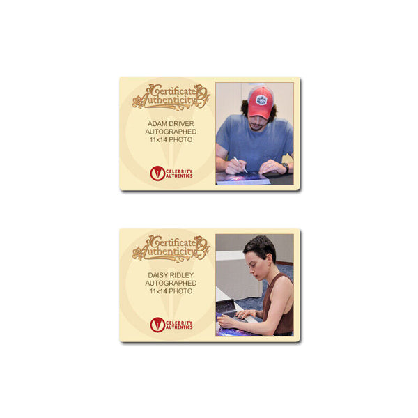 This fantastic 11x14 scene photo of Kylo Ren and Rey battling on the Starkiller Base has been personally hand-signed by Adam Driver and Daisy Ridley during their signings with Celebrity Authentics. Kylo Ren met Finn and Rey in the snowy forest outside and when Rey shot at him, he used the force to send her into a tree. Finn attacked Kylo with Skywalker's lightsaber and managed to give him a shoulder wound. Kylo sent the lightsaber flying several meters and stabbed the defector, severely injuring him. Kylo tried to use the force to steal Luke's lightsaber but it flew past him and into Rey's hand. They stared at each other for a moment before Rey activated the saber and attacked. Due to Kylo's injuries and Rey's growing power, the two are fairly even in their duel. Kylo attempted to draw her to the dark side towards the end of the duel but failed to do so. She managed to come out on top and slash Kylo across the face before the ground beneath them started to split in two, separating them. Ships affixed with the Celebrity Authentics serial-numbered and tamper evident Authentication Hologram and includes Celebrity Authentics Certificates of Authenticity featuring a picture of Adam and Daisy signing photo.Please note: with multiples signed by the actor, a sample photo is used from stock to represent what you will receive. Exact autograph size and placement may vary.