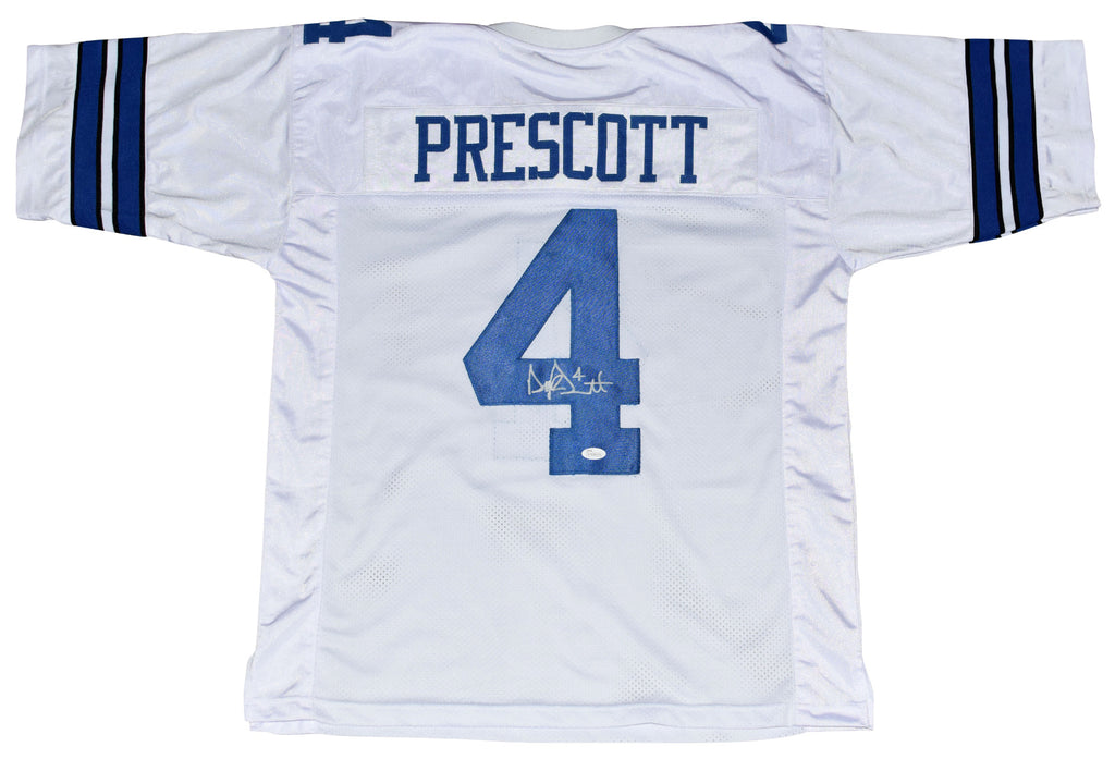 Dak Prescott, star quarterback for the Dallas Cowboys, has hand signed this white custom jersey at a private signing. Jersey is size XL and all letters/numbers are sewn-on. This item comes with a certificate of authenticity (COA) from JSA - James Spence Authentication and was signed in the presence of one of their representatives. You will receive a serial-numbered COA along with a matching serial-numbered sticker on the jersey. The authenticity can be verified online by entering the serial number.Item pictured may not be the exact item you will receive. It will be similar quality, and we guarantee your satisfaction.