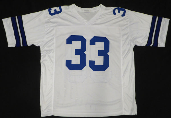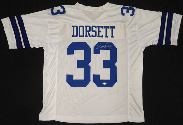 This is a White Jersey that has been hand signed by Tony Dorsett. This is a custom jersey with no name brand. The approximate size is XL. It has nice sewn in name and numbers. This item has been certified authentic by JSA and comes with their tamper-proof sticker BUT is missing the matching certificate of authenticity.