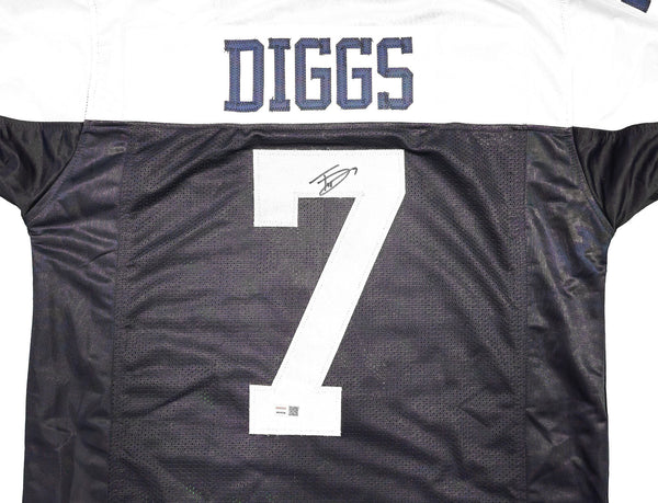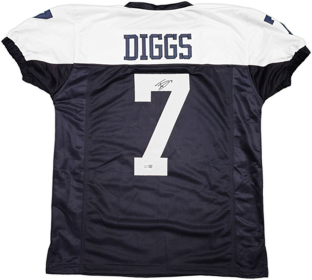 This is a Blue & White Jersey that has been hand signed by Trevon Diggs. This is a custom jersey with no name brand. The approximate size is XL. It has nice sewn in name and numbers. This item has been certified authentic by TriStar and comes with their tamper-proof sticker and matching certificate of authenticity.