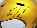 This is a Minnesota Vikings Flash Yellow Full Size Replica Speed Helmet that has been hand signed by Dalvin Cook. The Flash helmets are delicate and may have some marks or scratches on them. This item has been certified authentic by Fanatics and comes with their tamper-proof sticker.