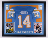 Custom frame measures approximately 35" x 43" in size and features a jersey which has been hand-signed and inscribed in black felt tip pen by Dan Fouts (HOF). The autograph includes an official James Spence Authentication (JSA) hologram and matching COA for authenticity purposes. The signing of this item was witnessed by JSA.Authentication: JSA COA