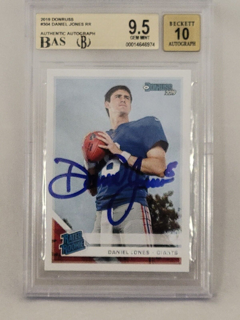Daniel Jones (New York Giants) Autographed 2019 Donruss Rated Rookie Card #304Card is graded a 9.5 by BeckettAutograph is on card and graded a 10 by BeckettBeckett # 00014646944