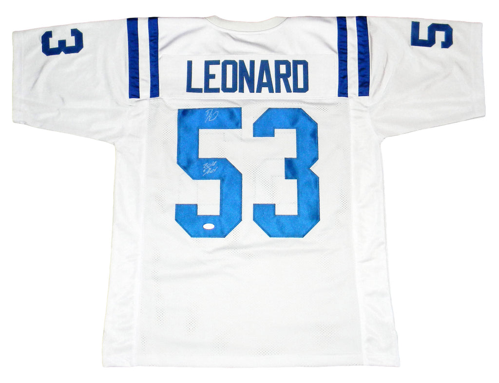Darius Leonard, Pro Bowl linebacker for the Indianapolis Colts, has hand signed this white custom jersey at a private signing. He included the inscription "2018 DROY". Jersey is size XL and all letters/numbers are sewn-on. This item comes with a certificate of authenticity (COA) from JSA - James Spence Authentication and was signed in the presence of one of their representatives. You will receive a serial-numbered COA along with a matching serial-numbered sticker on the jersey. The authenticity can be verified online by entering the serial number.Item pictured may not be the exact item you will receive. It will be similar quality, and we guarantee your satisfaction.