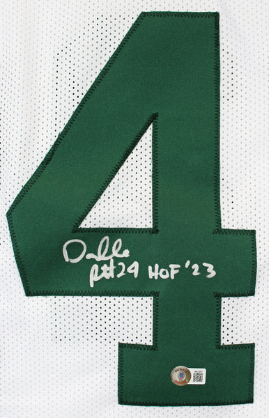This Autographed White Pro Style Jersey with the inscription of "HOF 23" has been Personally Signed by Darrelle Revis of the New York Jets. This item is 100% Authentic to include a hologram by Beckett Authentication Services. This item will come with an affixed Beckett Authentication Services (BAS) authentication sticker, which includes a scannable QR code to verify authenticity. Please note that Beckett no longer provides serial-numbered COA cards, and the attached BAS sticker will serve as the complete authentication for this item. This is a BAS Witnessed Protection Program item which means a Beckett Authentication Service representative was present when this item was being signed. We conducted an autograph signing with Darrelle Revis where multiples of the same item were signed. While the photographs are representative of this item, the size, placement and strength of the signature may vary. Each item is hand signed, therefore, each autograph is unique. This item can be verified through BAS Witnessed. This is a X-Large sized, non-branded, custom-stitched Jersey.