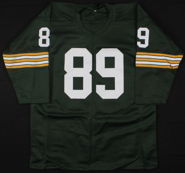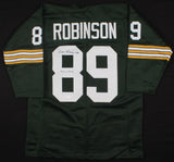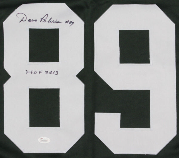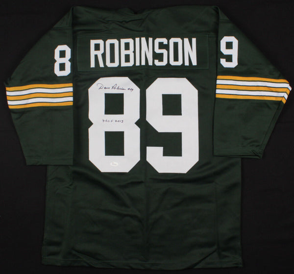 Custom on-field style jersey. Everything is sewn on, size XL. Hand-signed and inscribed in black felt-tip pen by Dave Robinson (HOF). The lot / autograph(s) includes an official James Spence Authentication (JSA) hologram and matching COA for authenticity purposes. The signing of this item was witnessed by JSA.Authentication: JSA COA