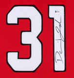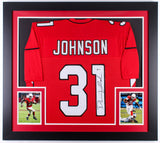 Custom frame measures approximately 31" x 35" in size and features a jersey which has been hand-signed in black felt tip pen by David Johnson. The lot / autograph(s) includes an official Beckett Authentication Services serially numbered hologram and matching COA for authenticity purposes. The signing of this item was witnessed by Beckett.Authentication: Beckett COA