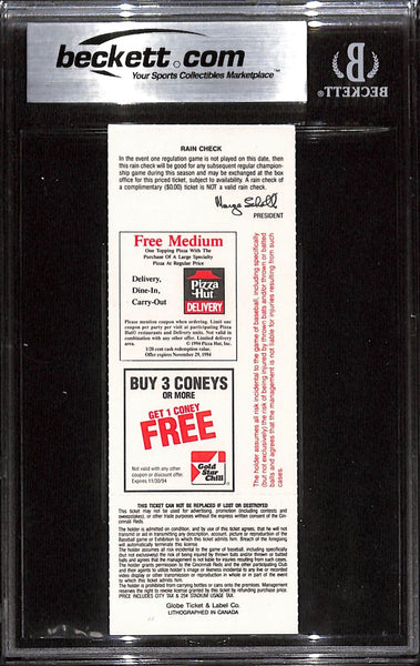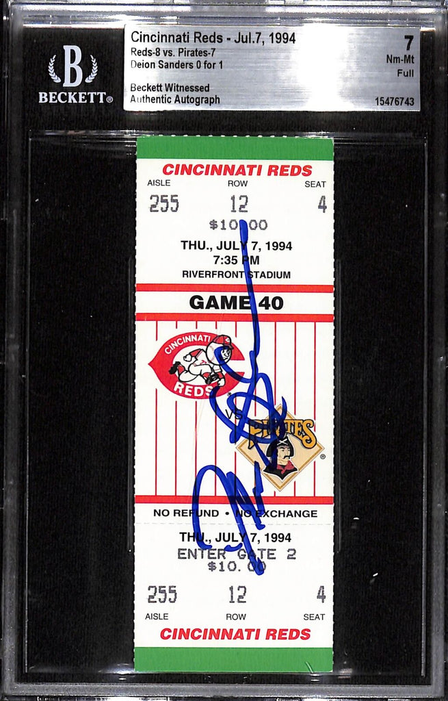 Deion Sanders Signed Cincinnati Reds 7/7/94 Slab Ticket 7 Grade Beckett 38808 The number in the listing title is just an inventory sku for our records and is not the authentication number. The item pictured is a stock photo unless otherwise noted. This is a Cincinnati Reds Slabbed Ticket Stub Grade 7 dated 07/07/1994 that was personally autographed by Deion Sanders. Includes a certificate of authenticity from Beckett Authentication Services (BAS) and Denver Autographs.