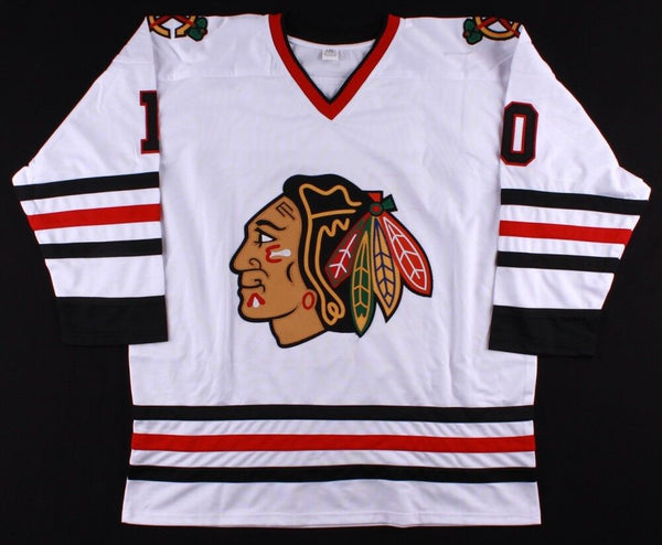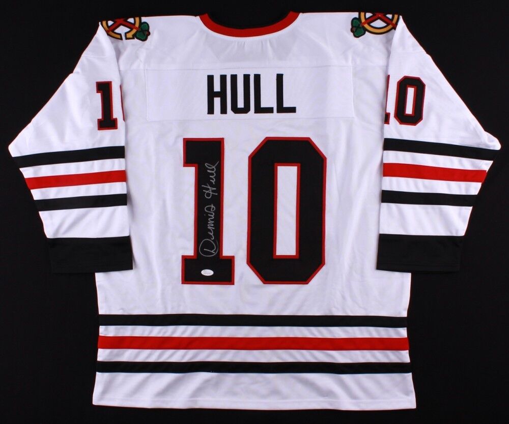 Custom on-ice style jersey. Everything is sewn on, size XL. The jersey has been hand-signed in silver paint pen by Dennis Hull (Red Wings). The lot / autograph(s) includes an official James Spence Authentication (JSA) hologram and matching COA for authenticity purposes. The signing of this item was witnessed by JSA.Authentication: JSA COA
