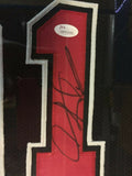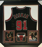 Custom frame measures approximately 36" x 39" in size and features a jersey which has been hand-signed in black felt-tip pen by Dennis Rodman (HOF). Includes an official James Spence Authentication (JSA) hologram and matching COA for authenticity purposes. The signing of this item was witnessed by JSA.Authentication: JSA COA